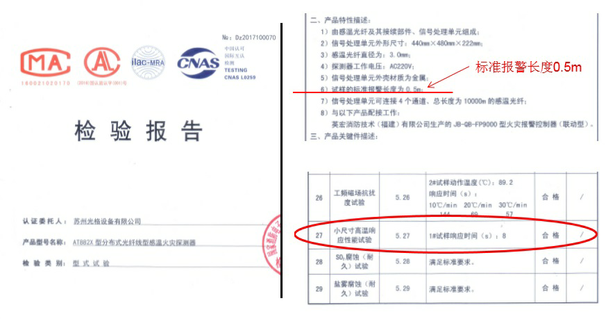 近日,蘇州光格設備有限公司研發生產的高分辨率線型光纖感溫火災探測器AT882X通過了國家消防電子產品質量監督檢驗中心型式檢驗,其中令人矚目的是,本次送檢產品標準報警長度為0.5米,除了國標規定的差定溫等一系列檢驗項目,還通過了“小尺寸高溫響應性能試驗”,這表明AT882X線型光纖感溫火災探測器產品,已能夠把DTS、感溫電纜、光纖光柵等綜合優勢融為一體,給客戶重要資產防災安全帶來更加可靠、便捷、經濟的解決方案。