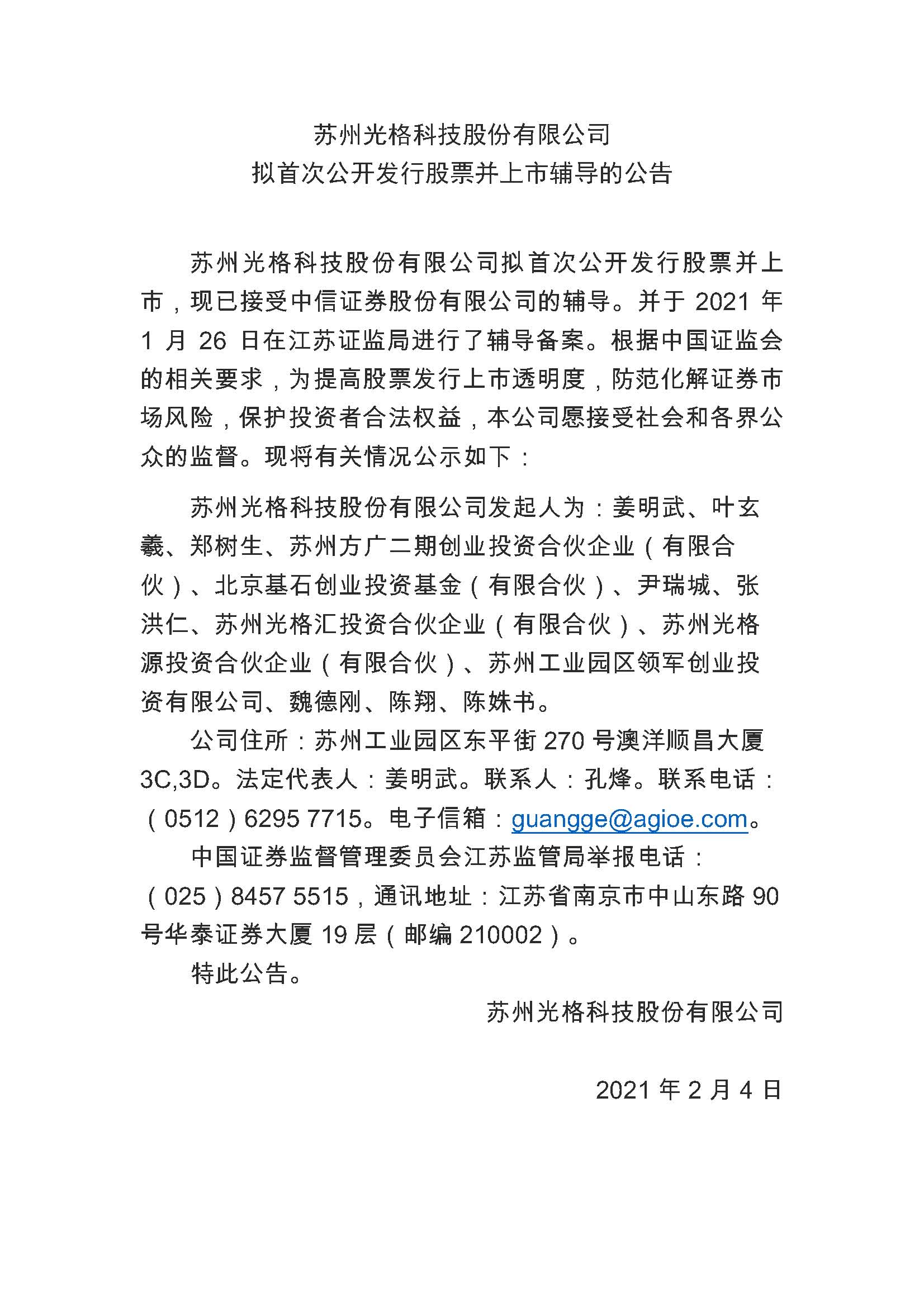 蘇州光格科技股份有限公司擬首次公開發行股票并上市輔導的公告