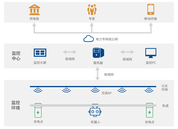 光格機器人智能巡檢系統由巡檢機器人本體、軌道系統、防火門控制系統、無線充電系統和通信系統組成,結合監控管理平臺,適用于電力隧道、綜合管廊、發電廠、配電房、大數據機房等無人值守環境下的監控場景。