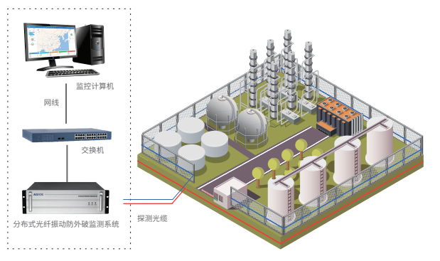 光格廠區(qū)周界安防系統(tǒng)由分布式光纖振動(dòng)防外破系統(tǒng)、探測(cè)光纜、上位監(jiān)控主機(jī)和基于GIS的周界安防綜合在線監(jiān)測(cè)軟件組成。