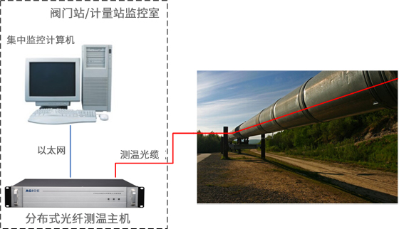 光格油氣管道泄漏監測系統由分布式光纖測溫主機及相應的測溫光纜組成,對管道的溫度進行連續線型實時在線監測,從而監測管道泄漏情況。整套監測系統通過其測溫控制主機通訊接口或干接點繼電器端子與管道SCADA系統相連,并負責向其提供報警信息及運行和故障信號。