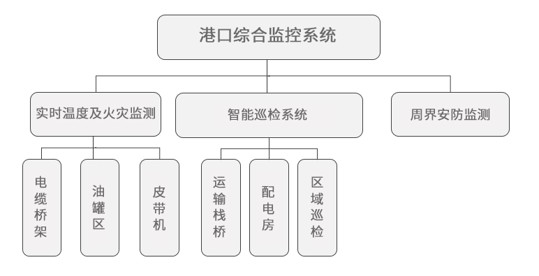 光格港口綜合監控系統主要由溫度及火災監測系統、智能巡檢系統系統和周界安防系統組成。系統針對港口各區域內安全防范需求,本方案對電纜橋架、油罐區、皮帶機、配電房、周界安全等重點場景實施安全在線監測,開發集硬件、軟件、網絡于一體的綜合監控系統,實現多平臺業務融合、降低運維成本,提高運維響應速度。